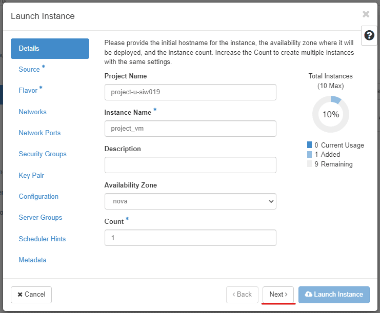 Choose Instance Name, Description, and number of instances. Click Next.