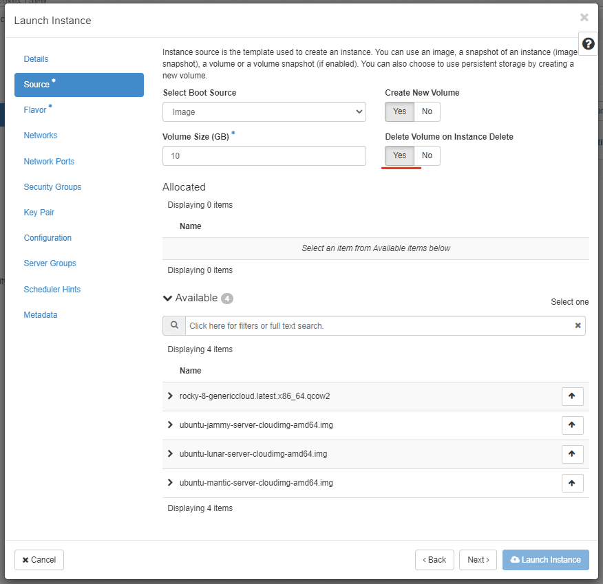Choose an image from which to boot the instance. Choose to delete the volume after instance delete. Click Next.
