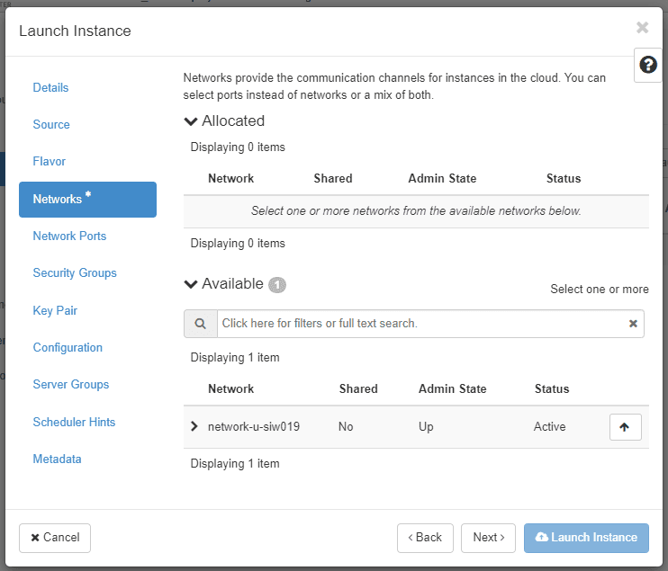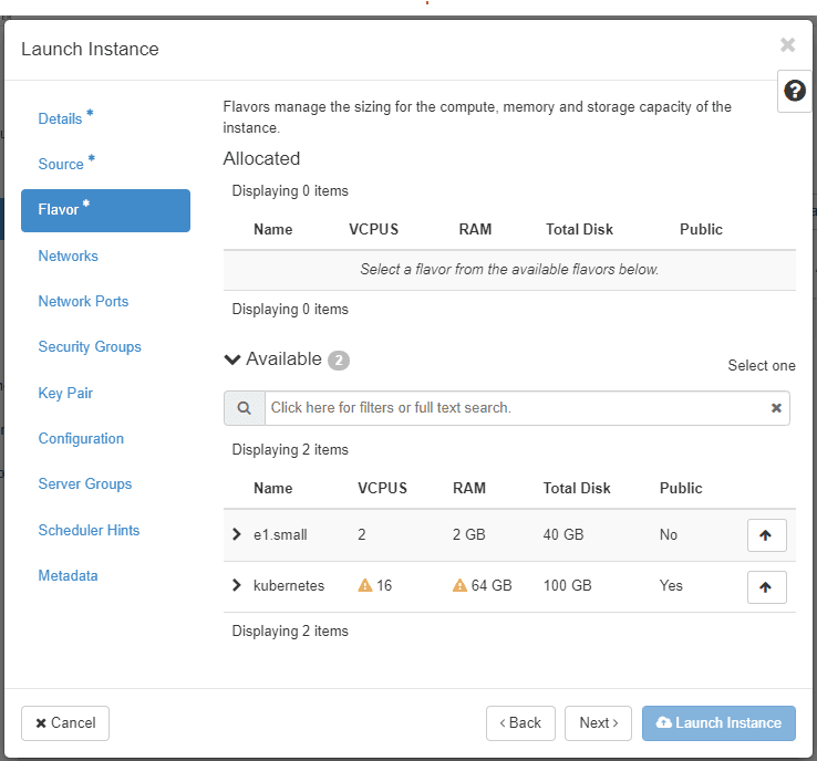 Choose the hardware resources of the instance by selecting a flavor. Additional volumes for data can be attached later on. Click Next.