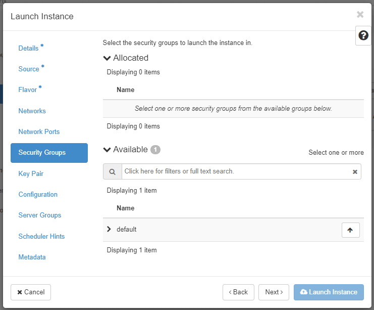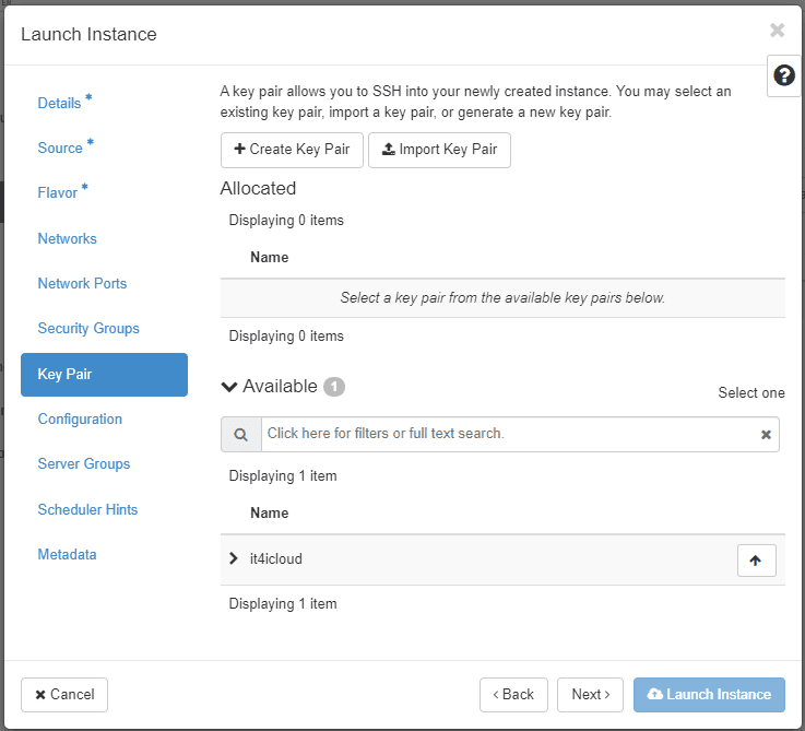 Allocate the security group with SSH rule that you added in the Update Security Group step. Then click Next to go to the Key Pair.