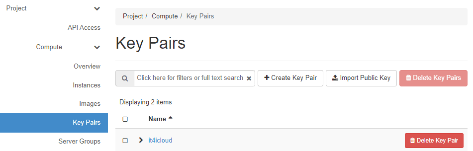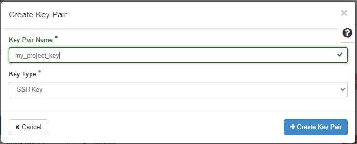 Go to Project > Compute > Key Pairs and click the Create Key Pair button.
