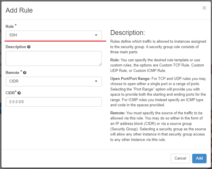 Click on Add Rule, choose SSH, and leave the remaining fields unchanged.