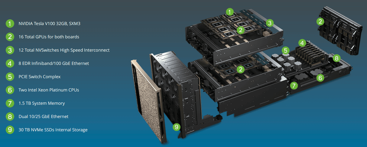 With NVLink2, it enables 16x NVIDIA V100-SXM3 GPUs in a single system, for a total bandwidth going beyond 14 TB/s. Featuring pair of Xeon 8168 CPUs, 1.5 TB of memory, and 30 TB of NVMe storage, we get a system that consumes 10 kW, weighs 163.29 kg, but offers double precision performance in excess of 130TF.