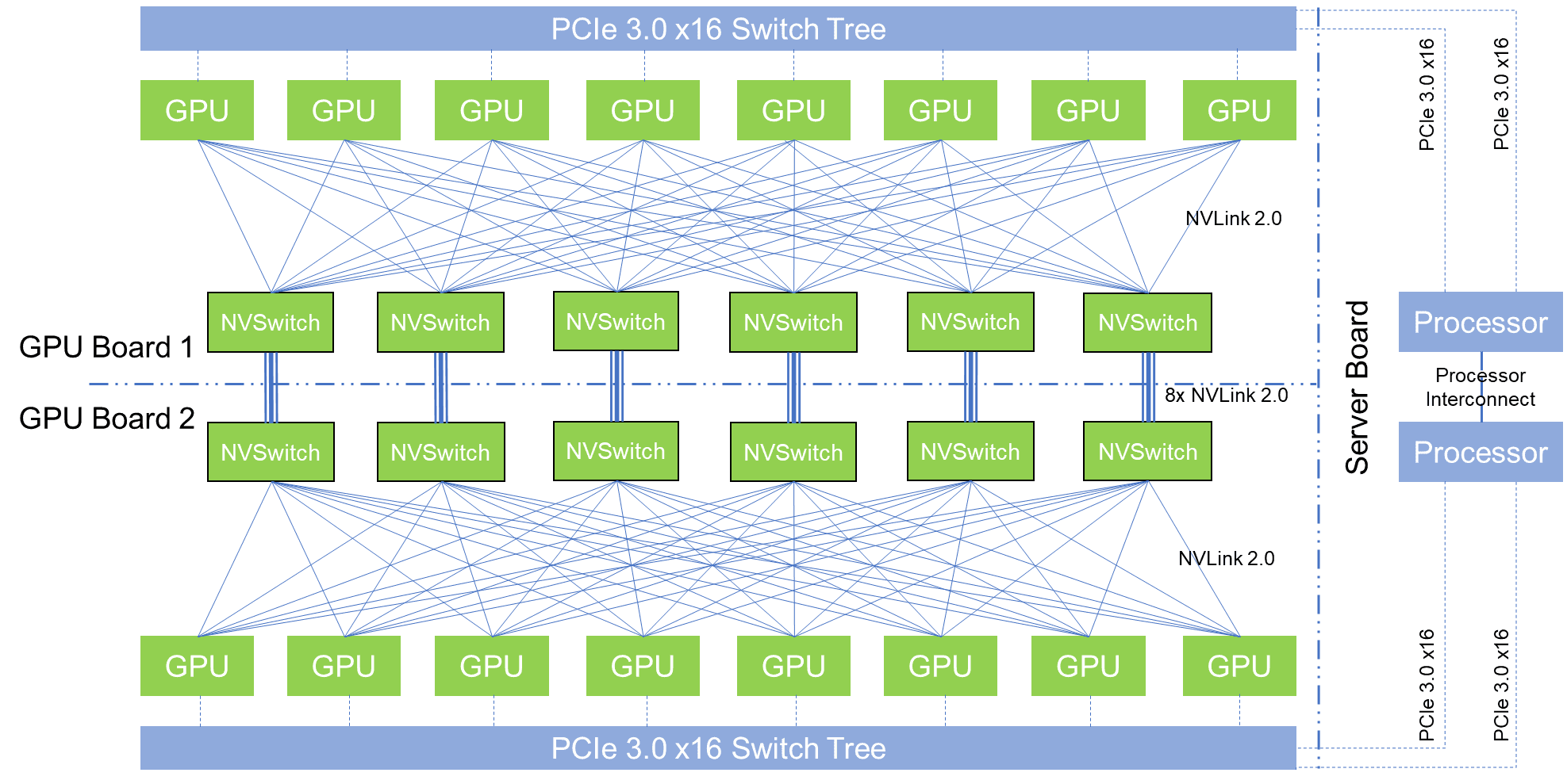The new NVSwitches means that the PCIe lanes of the CPUs can be redirected elsewhere, most notably towards storage and networking connectivity. The topology of the DGX-2 means that all 16 GPUs are able to pool their memory into a unified memory space, though with the usual tradeoffs involved if going off-chip.