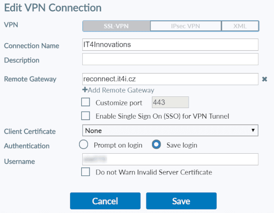 If you are member of a partner organization, we may ask you to use so called realm in your VPN connection. In the Remote Gateway field, include the realm path after the IP address or hostname. For example, for a realm excellent, the field would read as follows reconnect.it4i.cz:443/excellent.