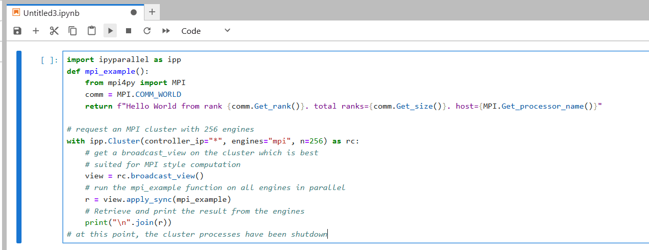 Paste the following sample code into your new notebook to run a parallel task using MPI: