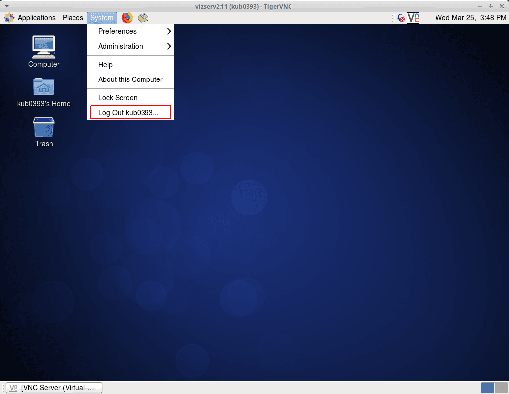 [yourusername@vizserv1 ~]$ vncserver :11 -geometry 1600x900 -depth 24