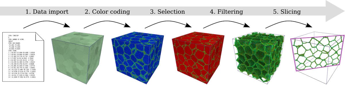 The dynamic pipeline concept makes it possible for you to change and adjust the sequence of applied operations at any time. In other words, OVITO enables you to work in a non-destructive manner with a dataset as all manipulation steps can easily be revoked. You can adjust the order of filter and manipulation operations, their parameters, and also the input data itself –the program will re-evaluate the pipeline and update the display in real-time. Thanks to intelligent data caching and parallelization techniques implemented in OVITO, this all happens without interrupting your workflow.